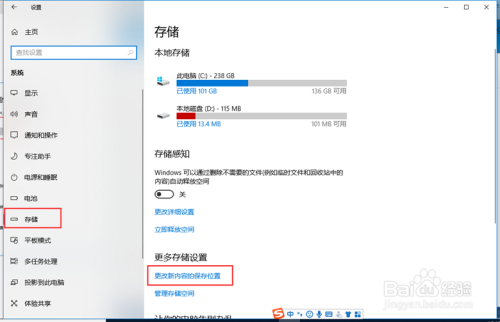 在系统设置界面,点击“存储”—“更多存储设置”—“更改新内容的保留位置”,进入更改新内容的保留位置界面。
