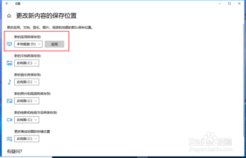 在更改新内容的保留位置界面,选择应用的默认保留位置,如选择D盘,点击“应用”。