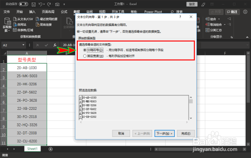 点击后,就会打开“文天职列标的目的导”弹窗,在弹窗中的第一步,我们可以选择利用“分隔符号”或者“固定宽度”来对选中的数据进行拆分。