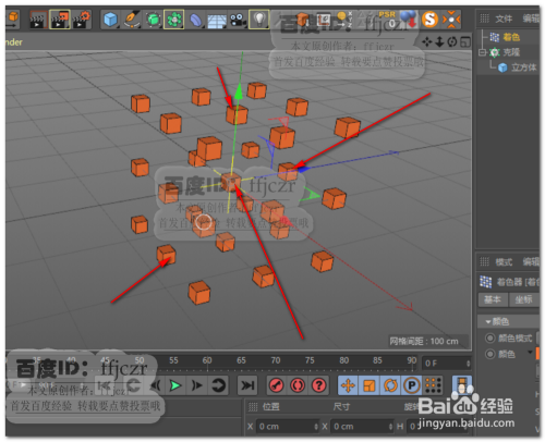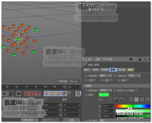 给克隆体添加上着色效器,打消结果器中位置、缩放及扭转的节制,将颜色项的模式更改为自界说,从其下的颜色拾取器中选择所要的颜色,即可更改克隆体的颜色。