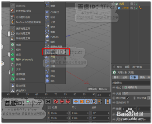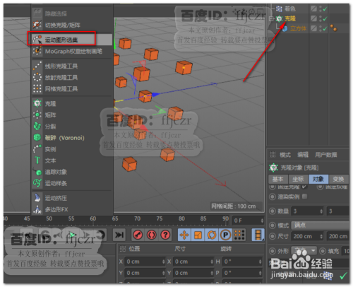 建立一个20*20*20的立方体,对立方体添加一个网格克隆,各轴上的数值均为3,尺寸为200*200*200.
