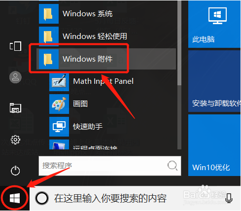 点击桌面左下角windows图标,打开windows附件;