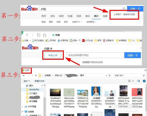若是你找到了可以用的图片。可是比力恍惚,或者太小,可以图搜图哟!点击搜索框最右边的【相机】图标,呈现【上传图片,搜刮相关信息】的字样,点击【当地上传】,就弹出【打开】对话框,去你的电脑中选中照片,点击【打开】