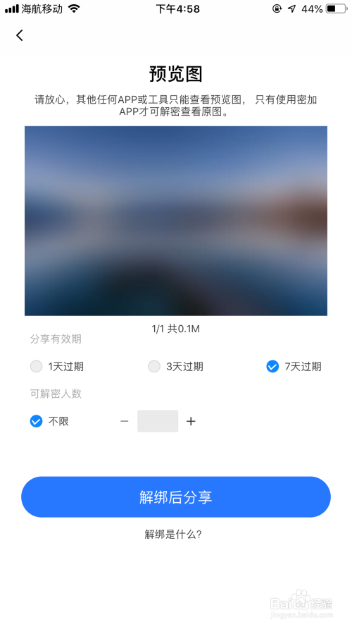点击下方分享密件,设置分享的有用期和可以解密的人数(举例申明:若设置为2,则近似于抢红包,最先解密的2人可查看原图,后面测验考试解密的人则解密掉败;若设置为不限,则在有用期内,所有接收者均可解密)