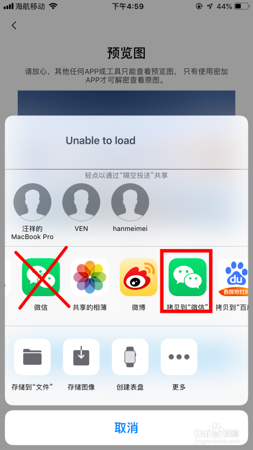 - 点击解绑后分享,选择拷贝到“微信”(请勿直接选择“微信”!)