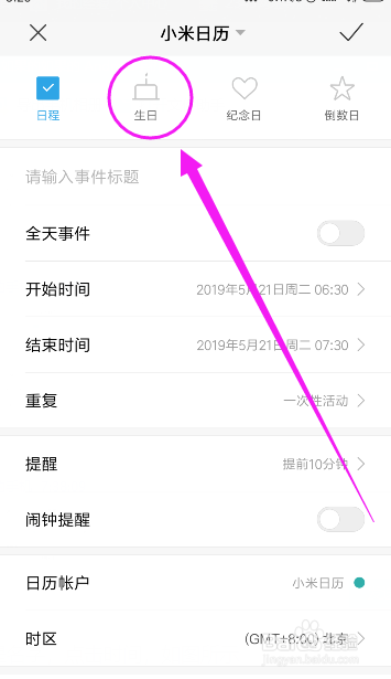 来到小米日历建立的页面,点击上面的生日欢愉,如图所示