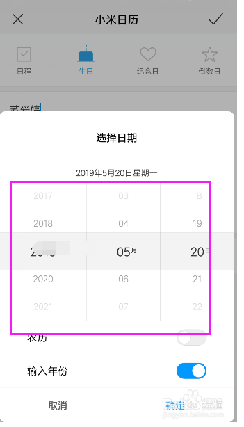 这时,就会标的目的上弹出时候的设置选项,设置生日时候,如图所示