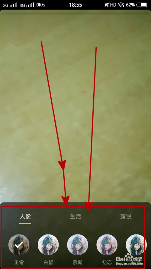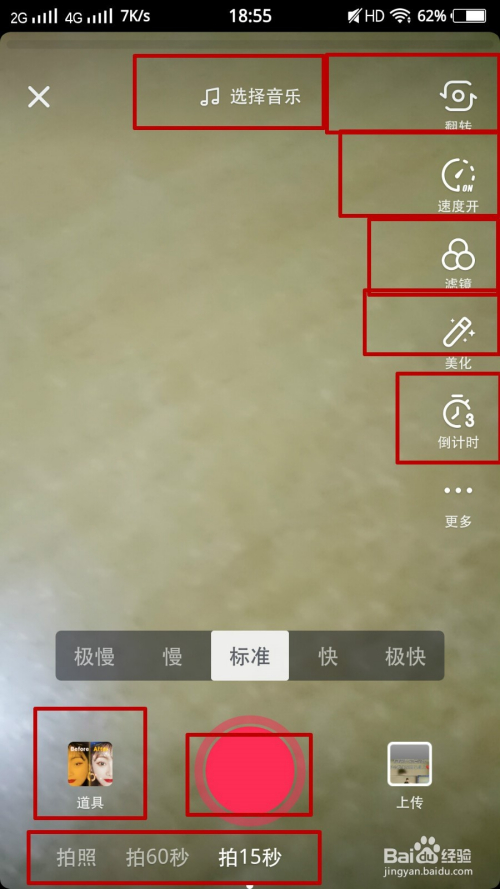 进入到拍摄界面,我们可以看到如图有良多红框框的处所,这些都是用来美化的东西