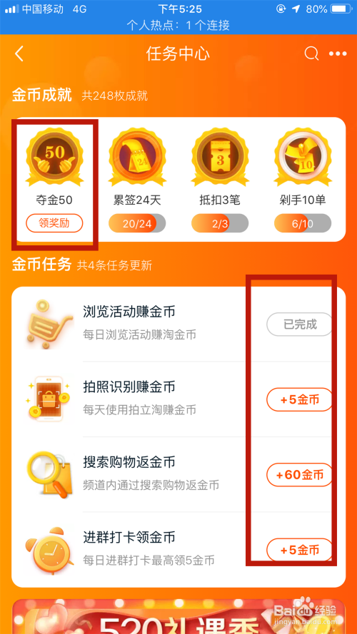 这是今日使命页面,可以经由过程“金币当作就”及“金币使命”来获取淘金币