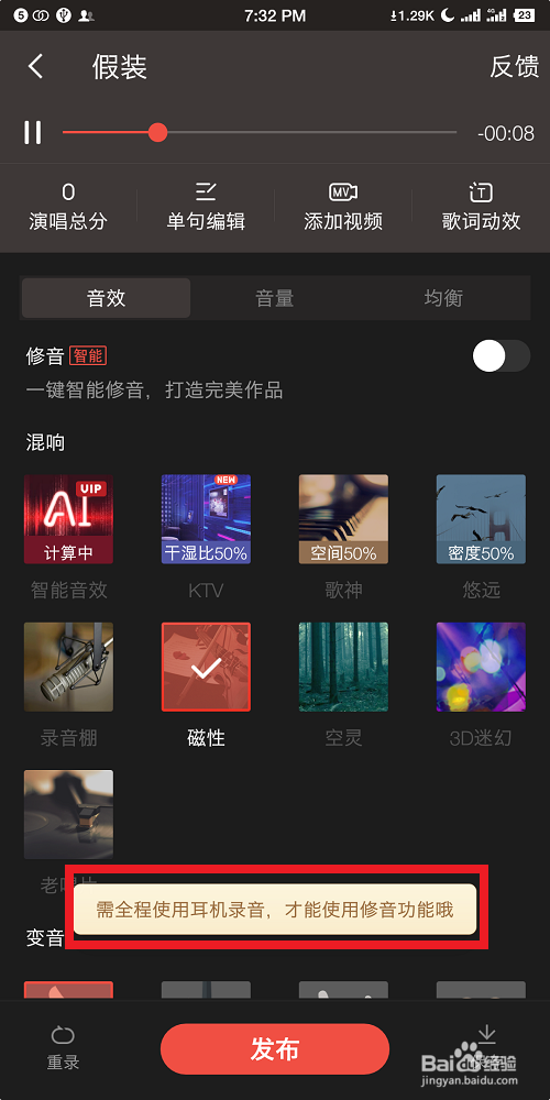需要注重的是,若是我们想要利用修音这个功能的话,就需要在录制的全程中连结利用耳机。