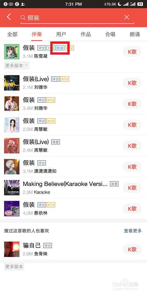 我们搜刮我们想要唱的歌曲。然后,确保这首歌曲是可以进行修音的。