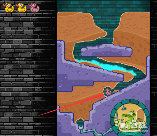 在第二关中增添了难度,这里呈现了硬石头,我们需要把水引进小鳄鱼浴缸就难了良多。首先我们先挖开第一只鸭子上方的土壤,然后沿着硬石头的偏向指导水流下来。然后获得第一只鸭子,如下图