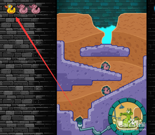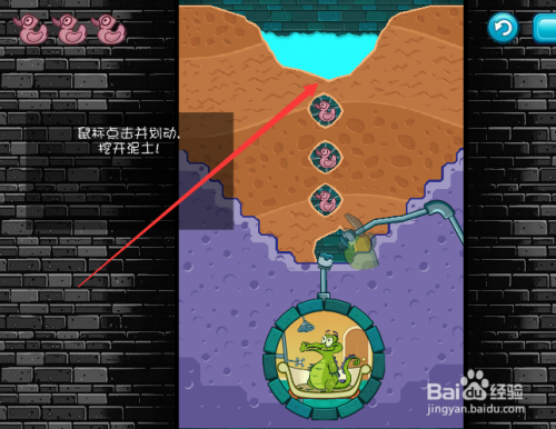点击游戏起头后我们会发此刻小鳄鱼的窗外有良多鳄鱼,他们都是粉碎者,第一关需要获得三个保藏品才能解锁当作功,这时我们鼠标沿着一竖列鸭子位置往下滑动,挖开土壤,如下图