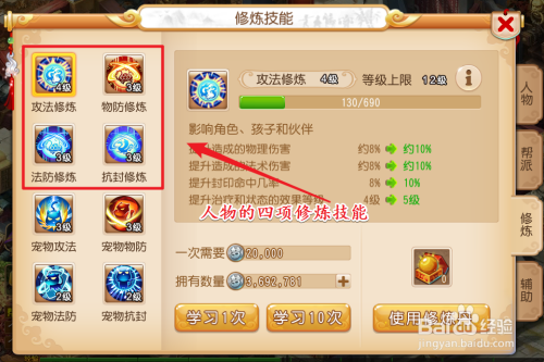 功法修炼:可以晋升物理,神通危险。晋升封印射中率,晋升治疗和状况结果品级。