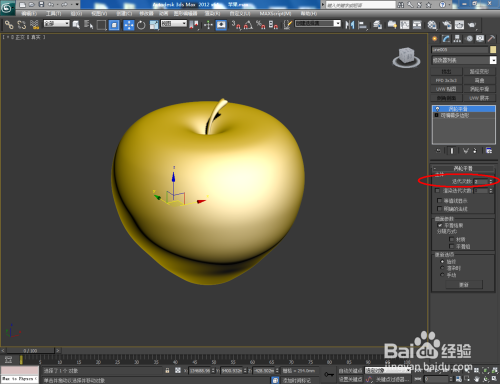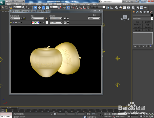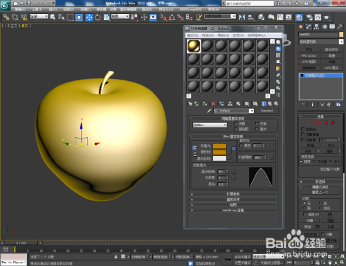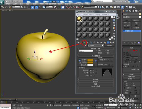 点击【材质编纂器】,按图示设置一个黄金材质球并设置好黄金材质球的各个参数后,将黄金材质附加给苹果模子。最后,点击【衬着】将黄金苹果衬着出图即可。
