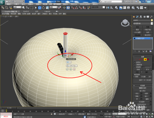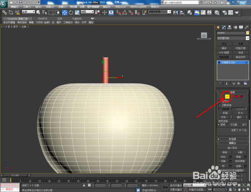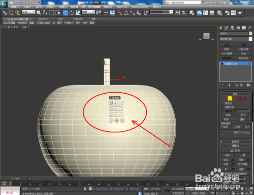 点击【面】图标,选中图示模子上的面后,点击【FFD4*4*4】。点击工作区中的【节制点】,按图示对模子上的节制点进行移动和扭转调整,完当作苹果模子的建造(如图所示);