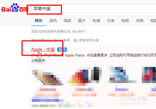 打开百度搜刮栏,接着输入【苹果中国】,进入苹果官网