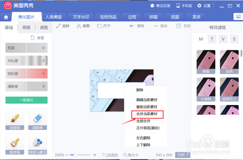 调整好之后在点击鼠标右键,在弹出的菜单框中选择归并当前素材,归并好之后在点击左上角的的文字水印,进入编纂文字。