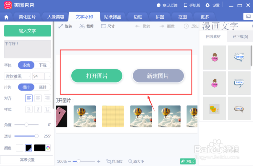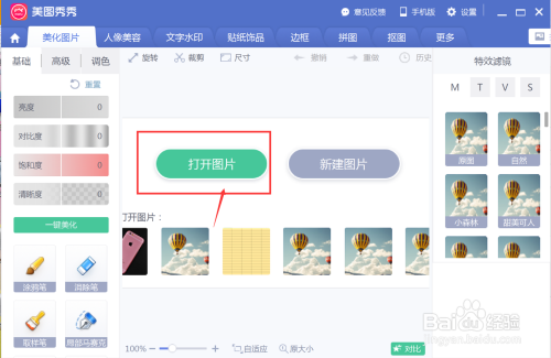 首先在电脑上打开美图秀秀进入本家儿页,在本家儿页上找到打开图片点击进入;