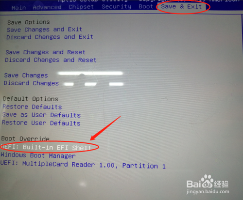 电脑开机,在呈现开机LOG后不断地按下“delete”键,直到进入BIOS界面,经由过程键盘选择Save&Exit→UEFI:built in Eft·shell,按下回车键,如图: