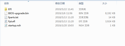 筹办工作:刷BIOS需要BIOS文件以及其东西,都可以在厂商的官方网站上面找到。这里以BIOS文件“BIOS-upgrade.bin”为例,东西选择Gemini lake平台下的刷写东西,包罗以下几个文件:EFI(文件夹)、fparts.txt、Fpt.efi、startup.nsh,如图: