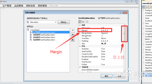 我们点击一下第一个菜单,这时在旁边会呈现这个菜单的相关属性,把右侧的滚动条往上拉,找到margin这个属性标签。
