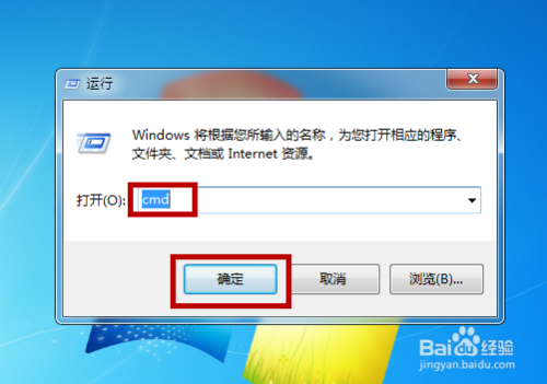在运行界面中输入【cmd】并点击【确定】,这样可以打开号令提醒符,如图所示。