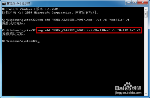 然后继续输入【reg add"HKEY_CLASSES_ROOT\.txt\ShellNew" /v"NullFile" /f】并点击确认键,比及提醒【操作当作功完当作】。