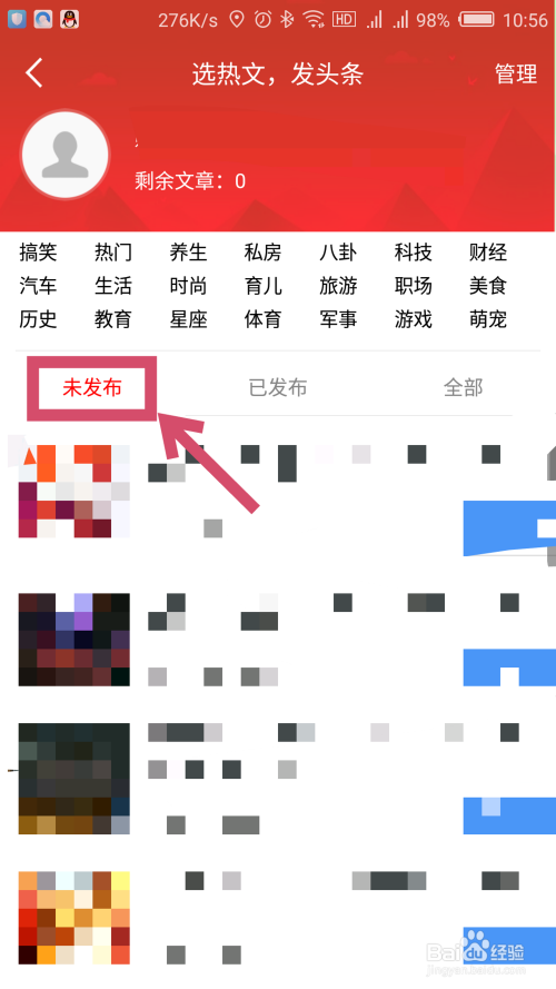 在打开的头条界面,能看到下面的未发布,点击打开未发布界面,默认打开的就是未发布。如图所示