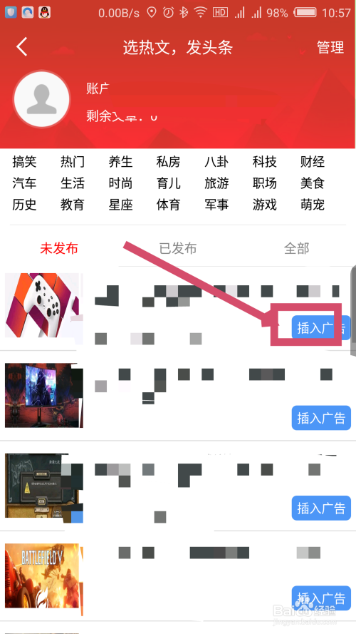 在未发布里面,选择一个头条,点击头条后面的插入选项。如图所示