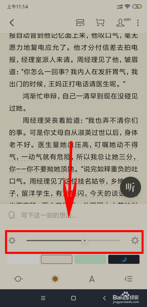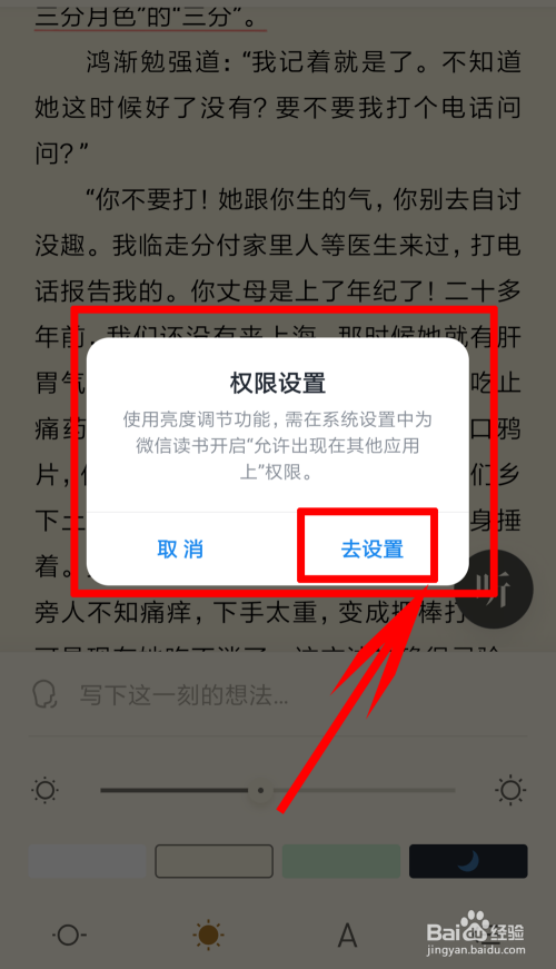 微信念书是一条目很不错的念书软件,看书的时辰,我们可能需要调节屏幕亮度,若是去调节手机的亮度,有一些麻烦,可是调节微信念书的亮度,可能会出一些错,这里给大师说一下如何不呈现错。
