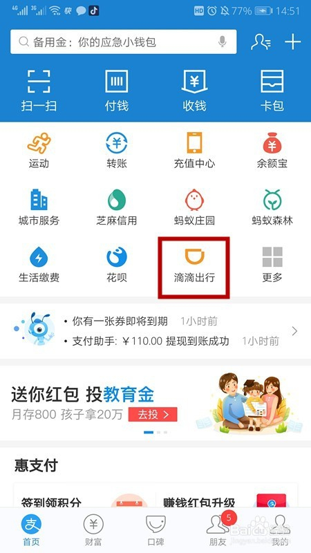 首先打开支付宝本家儿页,再点击滴滴出行,有提醒要知道你的位置,点击好,如下图所示。