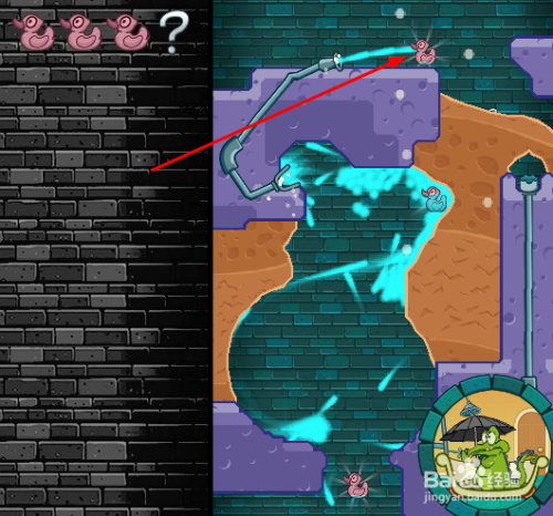 在第10关中,首先挖开左边鸭子上面土壤,然后打开阀门开关一向点住阀门,获得第一只鸭子,如下图