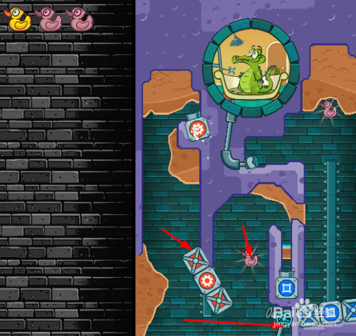 然后挖开第二只鸭子上方所有土壤,打开阀门并一向点住,让水灌满右边然后点击方块开关,获得第三只鸭子的同时,也把水引进小鳄鱼浴缸内了。