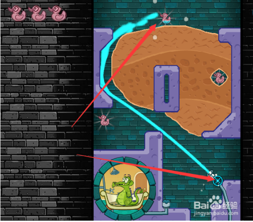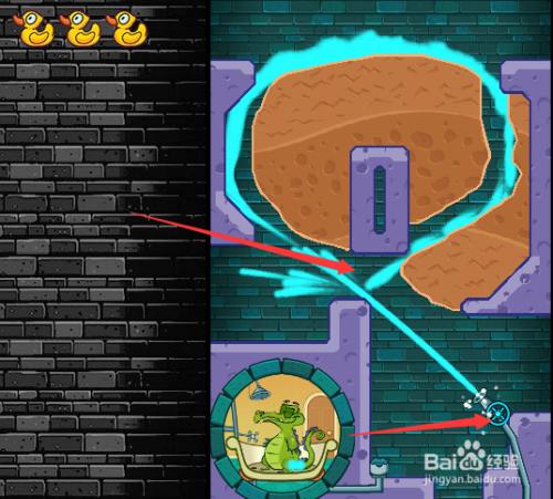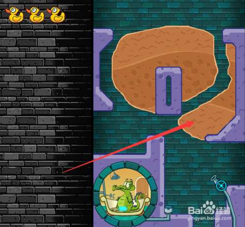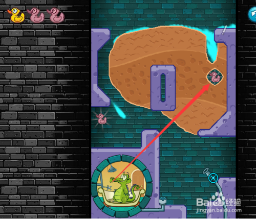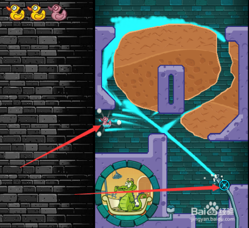 首先我们打开阀门开关并一向用鼠标点住阀门开关,这样水会有一股冲力,然后获得第一只鸭子,如下图