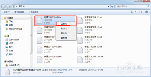 选择收受接管站中任何一个文件,点击右键“还原”,就能将这个文件还原到本来被删除的位置,对于此处演示的文件,就是回到第2步建立的文件夹下面去