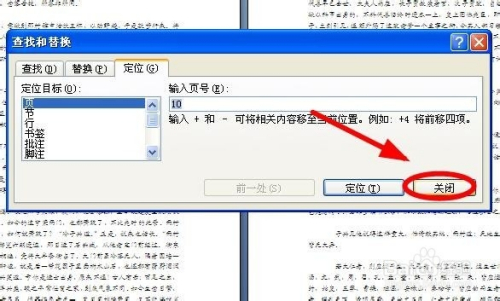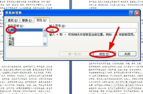 今天我们要利用的是“定位”选项卡。在“定位方针”中选择“页”,“输入页号”下面输入“10”后,单击“定位”