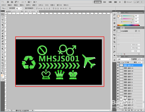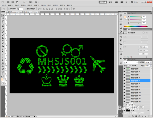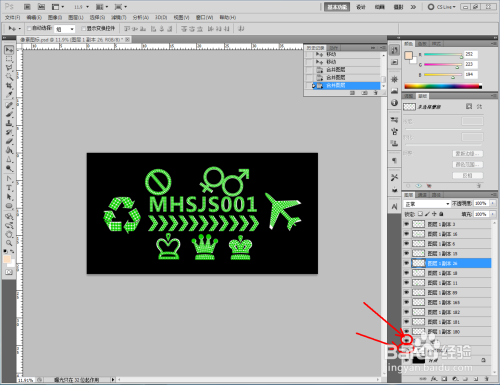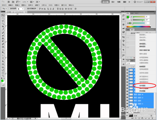 经由过程对绿圆图案的移动复制,以前面建造好的辅助图案为参考,建造出辅助图案1的像素图标。选中所有绿圆图层,点击鼠标右键-【归并图层】进行图层归并。按照同样的步调,完当作其他像素图标的建造后,将辅助图案图层埋没(如图所示);