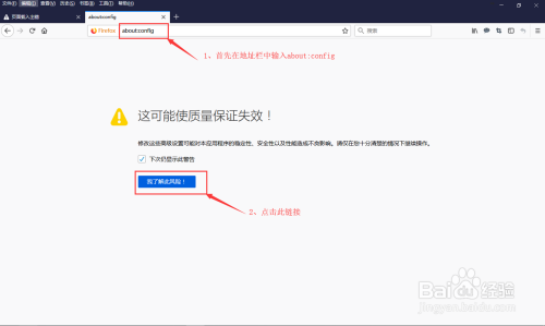 在火狐浏览器中打开一个新的标签页,输入 about:config,然后点击“我