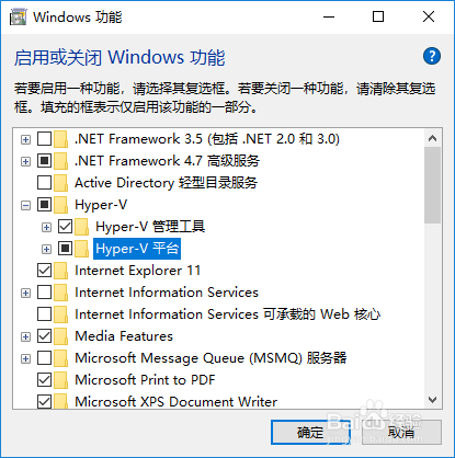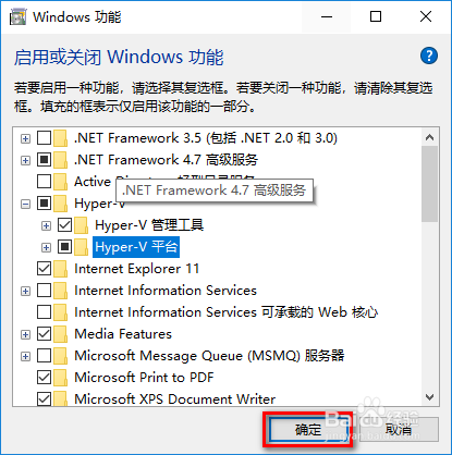 勾选对话框中的“Hyper-V”复选框;
