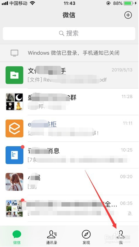 若是想加老友快速经由过程,不利用验证,可以登录微信之后,点击右下角的“我”,如图所示。