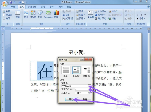 在呈现的对话框中可以选择字体、首字下沉的行数,然后点击确定。