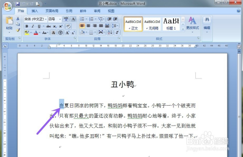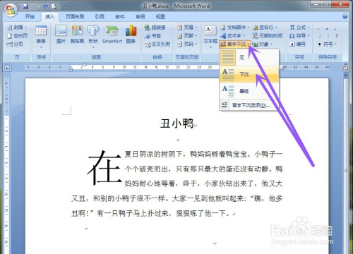 首字选中鼠标右击在呈现的对话框中选择首字下沉。