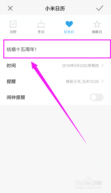 跳转到纪念日设置的页面,输入纪念日内容,如图所示