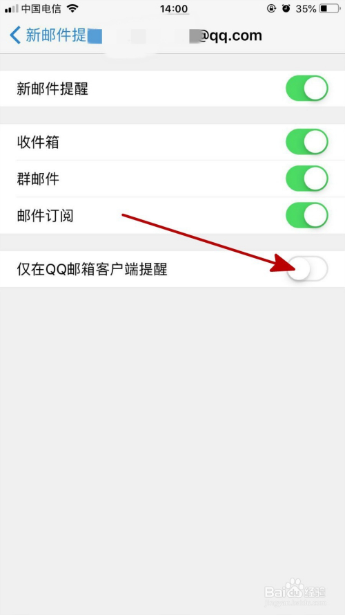 接着选择“仅在QQ邮箱客户端提醒”后面的开关,如下图