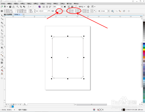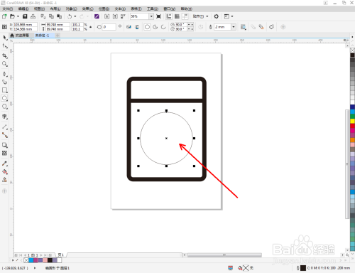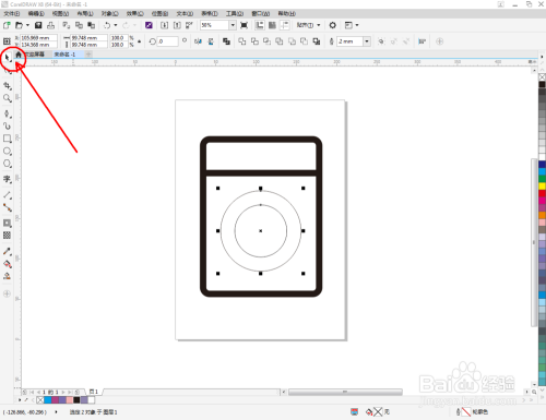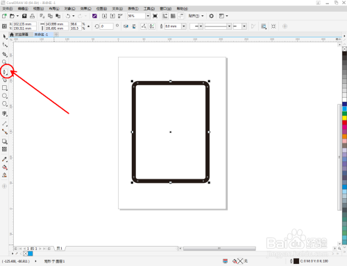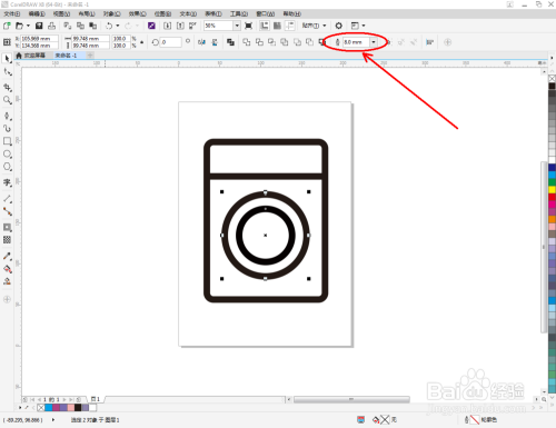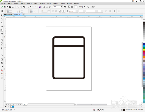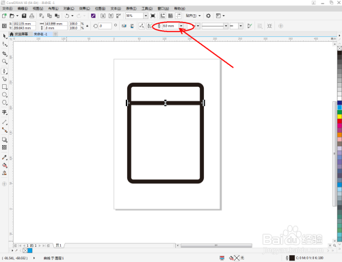 点击【矩形东西】,在作图区域绘制一个矩形图案。选中图案,点击【圆角】图标,按图示设置好圆角参数和轮廓宽度。点击【钢笔东西】绘制一条线段,并设置好线段的轮廓宽度(如图所示);