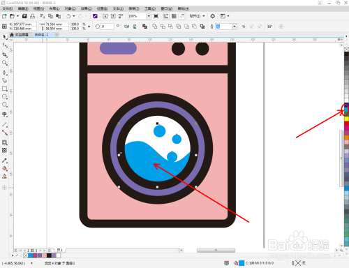 选中洗衣机本家儿体部门,鼠标左键点击右边色板中的粉色色块将其填充为粉色。按照同样的步调,完当作洗衣机各构成部门图案颜色的填充。到这里,我们的整个洗衣机图标就全数建造完当作。