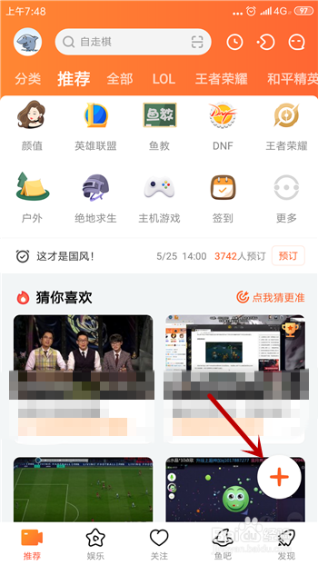 在斗鱼直播的首页右下角处能看到【+】按钮,若是没有就上下移动下屏幕就能看见,点击这个按钮。