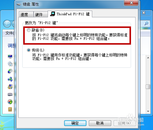 然后在【Thinkpad F1-F12键】默认的勾选是【传统】,这里我们需要把它改为【缺省】。