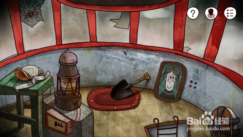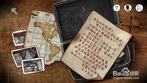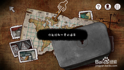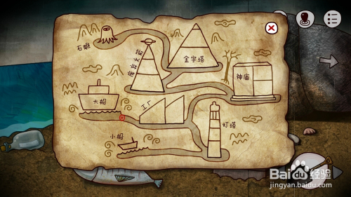 回头看一下就会发现被箱子压住的地图有线索,。上面标注了一个红色圈圈的岛屿就是我们此刻的位置,就很简单